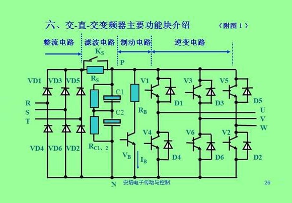現(xiàn)主要介紹電壓型變頻器結構及原理,電壓型變頻器主電路包括:整流電路、中間直流電路、逆變電路三部分組,交-直-交型變頻器結構見附圖1
