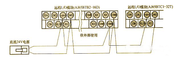 (2)直流24V線路連接。遠程I/O站(內(nèi)部和外部I/O)的直流24V電源線的連接如下圖所示。連接前一定要斷開電源,注意正負極性。