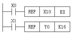 (1)輸入輸出刷新指令REF REF(P)指令的編號(hào)為FNC50。三菱FX系列plc采用集中輸入輸出的方式。如果需要最新的輸入信息以及希望立即輸出結(jié)果則必須使用該指令。如圖1所示,當(dāng)X0接通時(shí),X10~X17共8點(diǎn)將被刷新;當(dāng)X1接通時(shí),則Y0~Y7、Y10~Y17、共16點(diǎn)輸出將被刷新。