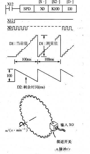 速度檢測指令SPD的編號(hào)為FNC56。它的功能是用來檢測給定時(shí)間內(nèi)從編碼器輸入的脈沖個(gè)數(shù),并計(jì)算出速度。如圖5所示,[D. ]占三個(gè)目標(biāo)元件。當(dāng)X12為ON時(shí),用D1對X0的輸入上升沿計(jì)數(shù),100ms后計(jì)數(shù)結(jié)果送入D0,D1復(fù)位,D1重新開始對X0計(jì)數(shù)。D2在計(jì)數(shù)結(jié)束后計(jì)算剩余時(shí)間。