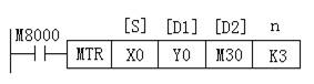 (3)矩陣輸入指令MTR MTR指令的編號(hào)為FNC52。利用MTR可以構(gòu)成連續(xù)排列的8點(diǎn)輸入與n點(diǎn)輸出組成的8列n行的輸入矩陣。如圖3所示,由[S]指定的輸入X0~X7共8點(diǎn)與n點(diǎn)輸出Y0、Y1、Y2(n=3)組成一個(gè)輸入矩陣。PLC在運(yùn)行時(shí)執(zhí)行MTR指令,當(dāng)Y0為ON時(shí),讀入第一行的輸入數(shù)據(jù),存入M30~M37中;Y1為ON時(shí)讀入第二行的輸入狀態(tài),存入M40~M47。其余類推,反復(fù)執(zhí)行。