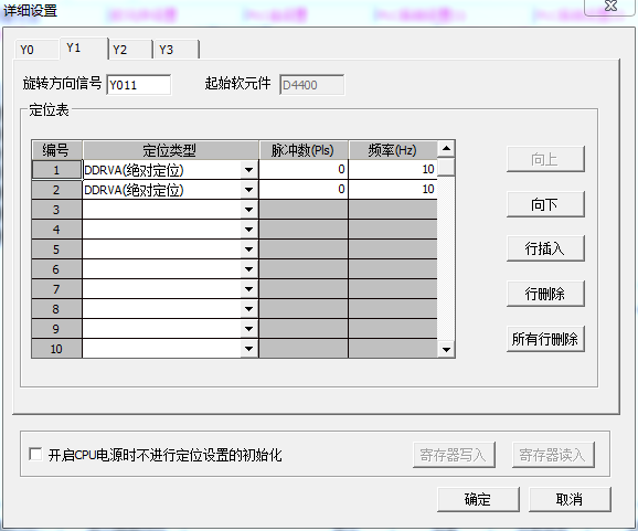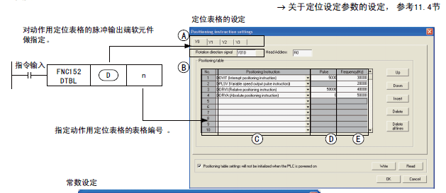 三菱PLC參數(shù)中的內(nèi)置定位設(shè)置的詳細(xì)設(shè)置中有起始軟元件,定位表中每個(gè)脈沖數(shù)和頻率的設(shè)置就從起始軟元件開(kāi)始每格占2個(gè)(32位數(shù)據(jù))依次排列,修改這些軟元件的數(shù)值就可以。例如起始軟元件是D4000,那么第一個(gè)表的脈沖數(shù)就是D4000+1,頻率是D4002+1,第二個(gè)表的脈沖數(shù)是D4004+1,頻率是D4006+1,這樣依此類推。