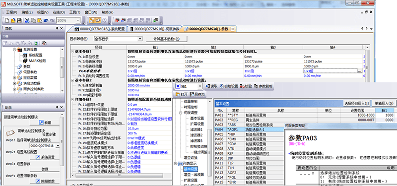 2、 利用軟件集成組態(tài)三菱人機界面對模塊參數(shù),OPR回零和伺服參數(shù)進行設(shè)置,非常簡單方便,無需單獨對三菱伺服進行參數(shù)設(shè)置,三菱伺服參數(shù)和程序一體化,方便備份和讀取/寫入。