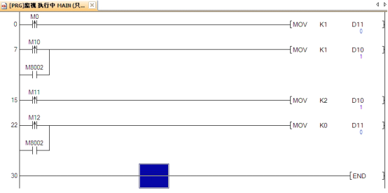 5、我們用 PLC 編程軟件寫一個程序,把上面創(chuàng)建畫面所用到的幾個軟元件和 PLC 的程序相關(guān)聯(lián)起來。