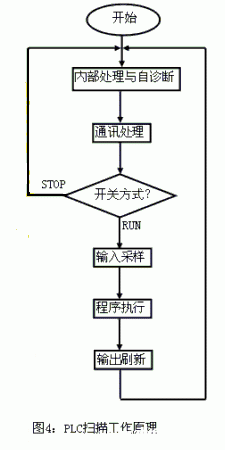 PLC的CPU采用循環(huán)掃描的工作方式。一般包括五個階段(如圖所示):內(nèi)部診斷與處理,與外設(shè)進行通訊,輸入采樣,用戶程序執(zhí)行和輸出刷新。當(dāng)方式開關(guān)處于STOP時,只執(zhí)行前兩個階段:內(nèi)部診斷與處理,與外設(shè)進行通訊。