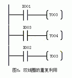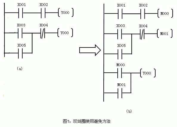 圖(b)中,X001和X002接點控制輔助繼電器M000,X003~X005接點控制輔助繼電器M001,再由兩個繼電器M000,M001接點的并聯(lián)組合去控制線圈Y000。這樣邏輯關(guān)系沒變,卻把雙線圈變成單線圈。