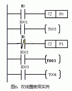 注意:我們所說的是不宜(最好不要)使用雙線圈,雙線圈使用并不是絕對禁止的,在一些特殊的場合也可以使用雙線圈,這時就需要你有較豐富的編程經(jīng)驗和技巧了。下面我們會談到這一點。但對于初學(xué)者還是不要冒這個險。其實,從以上的例子可以看出,重復(fù)利用線圈之所以會造成Y003的輸出混亂,是由于程序是從上到下順序執(zhí)行的緣故造成的。但如果我們可以改變程序執(zhí)行的順序,保證在任何時刻兩個線圈只有一個驅(qū)動邏輯發(fā)生,就可以使用雙線圈。其中,最常用的方法就是使用跳轉(zhuǎn)指令。如下圖所示: