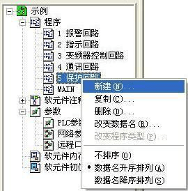 首先只要隨便右鍵單擊其中的任一項目,在彈出的窗口中選擇“新建”,然后在彈出的“新建”窗口中再選擇三菱PLC程序類型,數(shù)據(jù)名和索引就可以了。建立分類程序的方法很簡單如下圖所示: