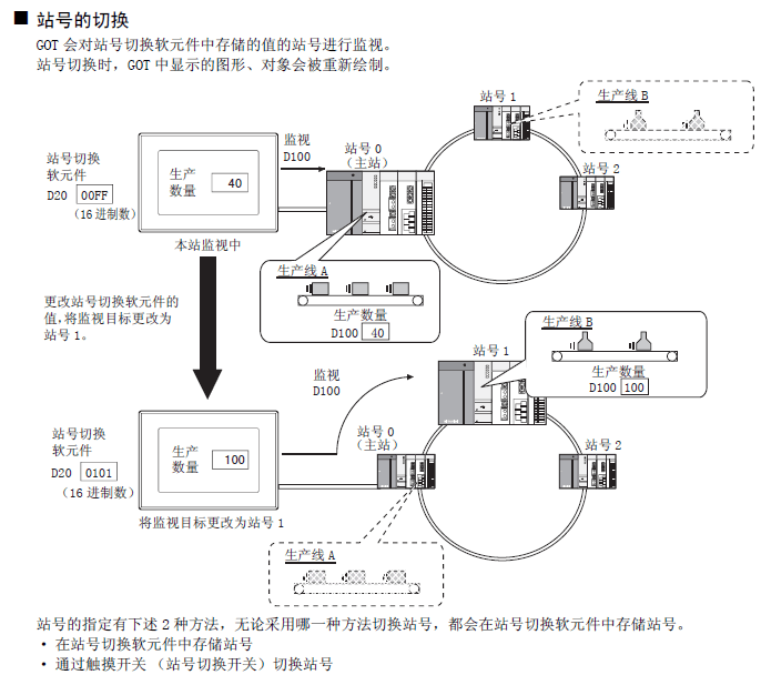 二:實際使用中根據(jù)不同機臺切換站號即可,三菱觸摸屏支持站號切換,將站號規(guī)定為軟元件從而靈活設置站號的切換