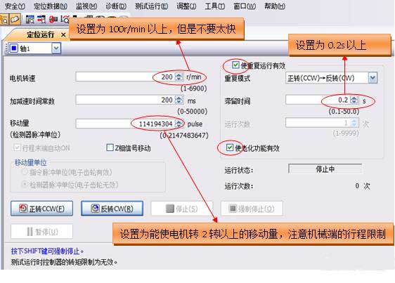 一鍵式調(diào)整需要在伺服電機運行中進行調(diào)整,因此,在進行調(diào)整期間,需要使伺服電機進行正反轉(zhuǎn)反復運行??梢韵仁褂?/span>“測試運行”功能使伺服電機進行定位運行。