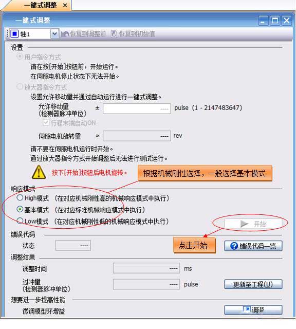 點擊開始后,系統(tǒng)開始一鍵式調(diào)整,出現(xiàn)以下畫面,整個調(diào)整過程大概幾分鐘。調(diào)整過程中可能會出現(xiàn)伺服電機輕微嘯響,屬于正常情況。