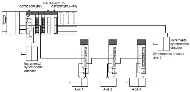 首先在如下圖所示,外部同步編碼器可以通過以下三種方式連接到三菱PLC Q172DS Motion的控制系統(tǒng)當中。通過外部連接的同步編碼器的輸入脈沖驅動輸入軸,投入電源后就可以監(jiān)控同步編碼器的狀態(tài).