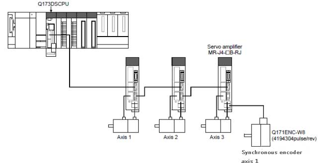 再比如另一種情況,假設三菱PLC模塊QD77MS控制的16軸需要進行同步控制,但是主軸是來自其他模塊控制的或者其他系統(tǒng)的三菱伺服放大器,則其不能當作伺服輸入軸,而需要通過三菱PLC同步編碼器軸進行輸入。