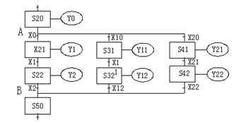 該狀態(tài)轉(zhuǎn)移圖有三個流程圖,S20為分支狀態(tài) ,根據(jù)不同的條件( X0,X10,X20), 選擇執(zhí)行其中一個條件滿足的流程。 X0,X10,X20不能同時為ON,S50為匯合狀態(tài),可由S22、S32、S42任一狀態(tài)驅(qū)動。