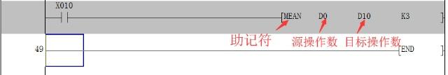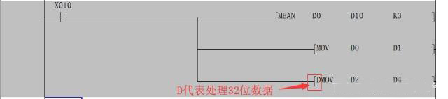 上圖中的例子就是說當(dāng)X10觸點(diǎn)接通,執(zhí)行命令MEAN,求3個(gè)數(shù)據(jù)寄存器D0~D2中的數(shù)據(jù)的平均值,并將結(jié)果存到D10中去。