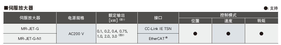 基于Ethernet,支持高速、大容量通信(1 Gbps)的CC-Link TSN的伺服放大器??赏ㄟ^(guò)最小指令通信周期125us 與速度率響應(yīng)2.5kHz,順利地進(jìn)行運(yùn)動(dòng)控制。MR-JET-G-N1伺服放大器支持EtherCAT?。(100Mbps)