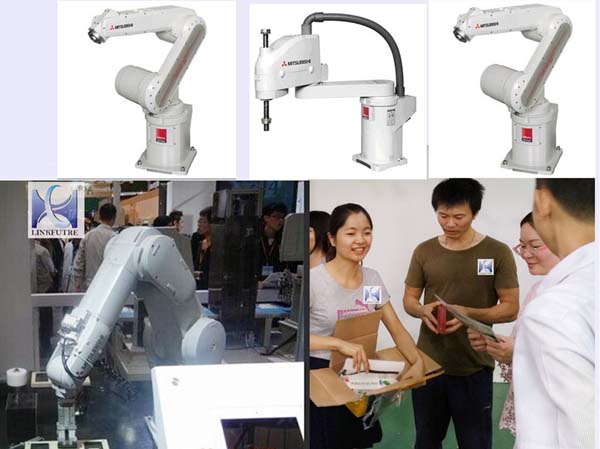 (圖為我司三菱機(jī)器人產(chǎn)品以及工作人員向顧客熱情解說我司三菱原裝機(jī)器人產(chǎn)品)
