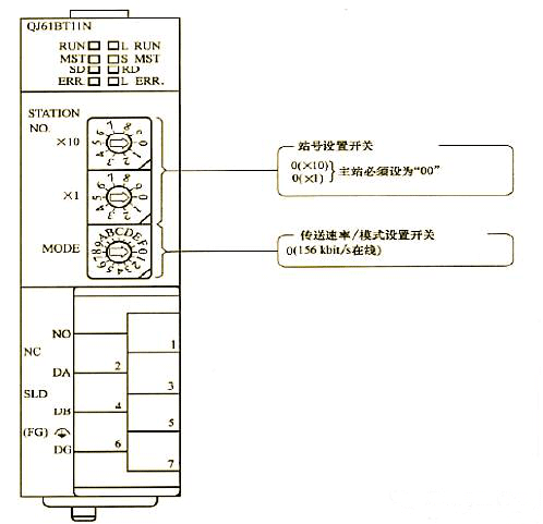 主站開關(guān)設(shè)置為,站號設(shè)置開關(guān):00 傳輸速度/模式設(shè)置開關(guān):0 如圖二:
