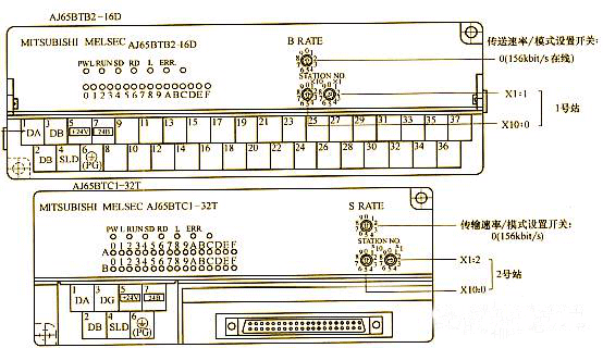 (2)遠程I/0站的設(shè)置為,AJ65BTB2-16D模塊的站號設(shè)置開關(guān):01 AJ65BTC1-32T模塊的站號設(shè)置開關(guān):02 ,他們的傳輸速度/模式設(shè)置開關(guān)都設(shè)置為:0 如下圖所示: