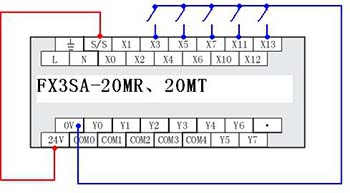 FX3SA 沒有 COM 端子,和 FX1S 在輸入接線處有點(diǎn)區(qū)別: