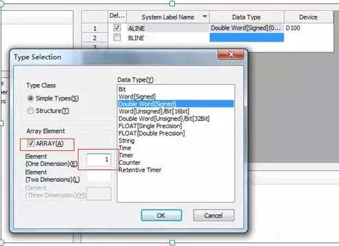 下面說明32位標(biāo)簽數(shù)據(jù)的設(shè)置,筆者將設(shè)置標(biāo)簽為”ALINE”表示D100-D101的雙字?jǐn)?shù)據(jù)。