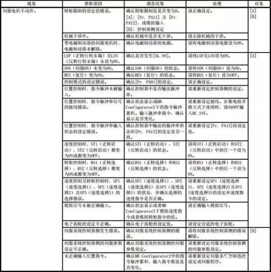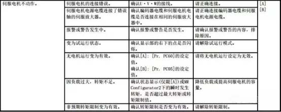 關(guān)于伺服電機不動作,可能的原因比較多,可以參考下表,逐一進行排查。