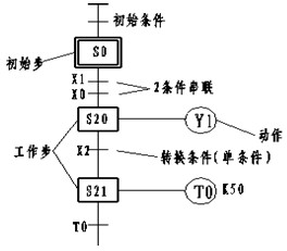 如圖所示,在初始步S0,沒有驅(qū)動動作,S20為其轉(zhuǎn)移目標(biāo),X0、X1為串聯(lián)的轉(zhuǎn)移條件;在S20步, Y1為其驅(qū)動動作,S21為其轉(zhuǎn)移目標(biāo),X2為其轉(zhuǎn)移條件。